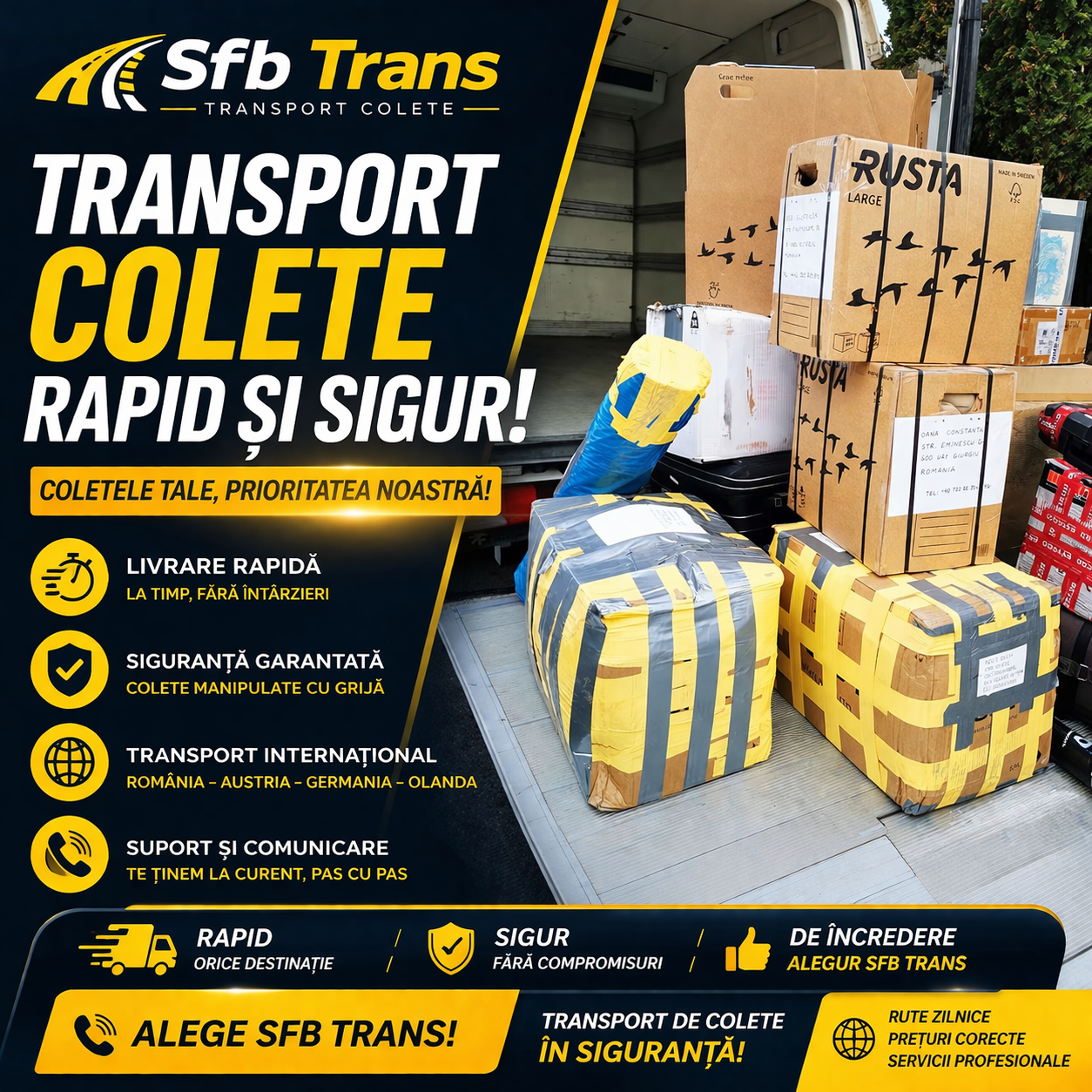 Operam pe rute externe (Austria, Germania, Olanda, Belgia), asigurând deplasări confortabile și livrări rapide, indiferent de destinații.